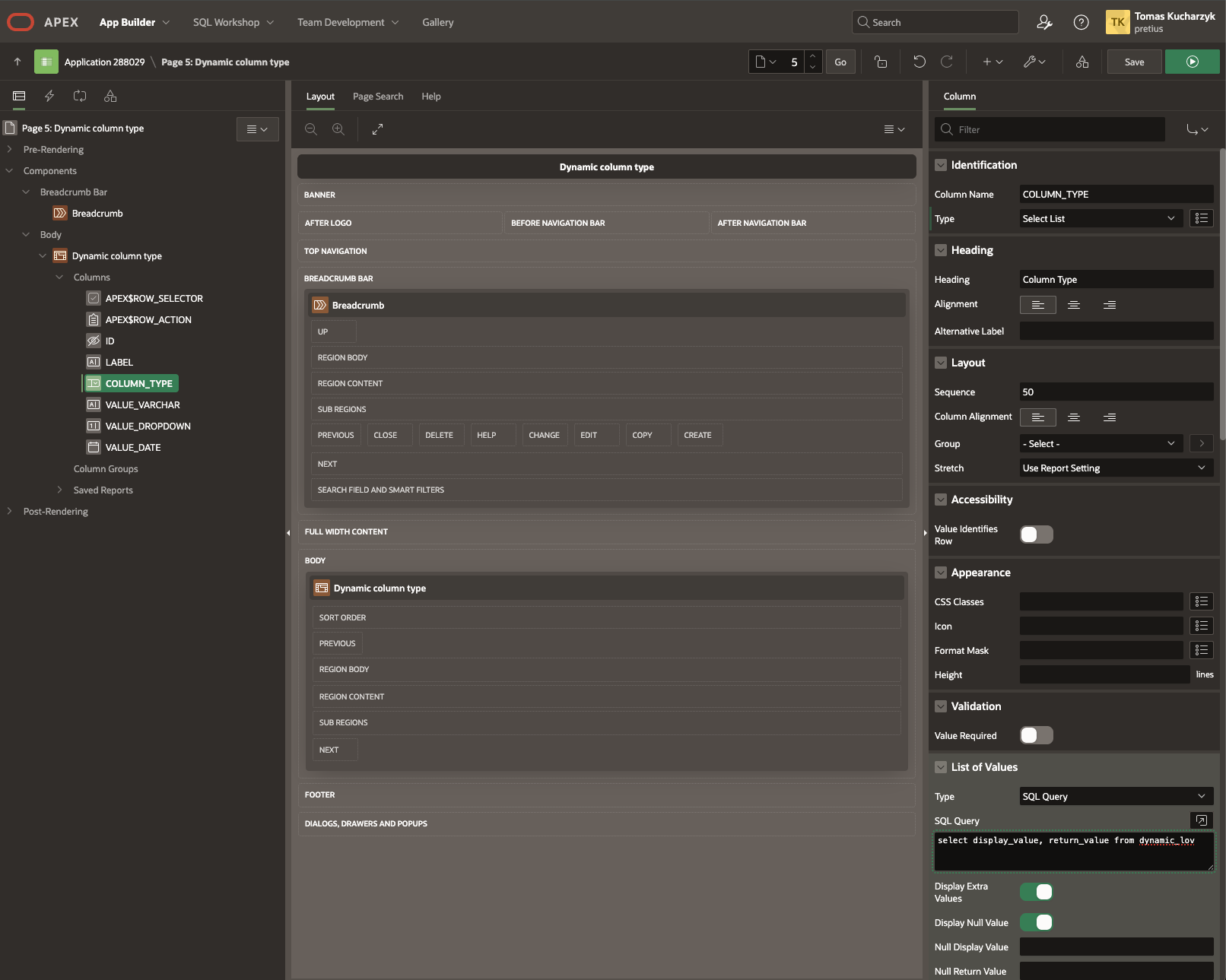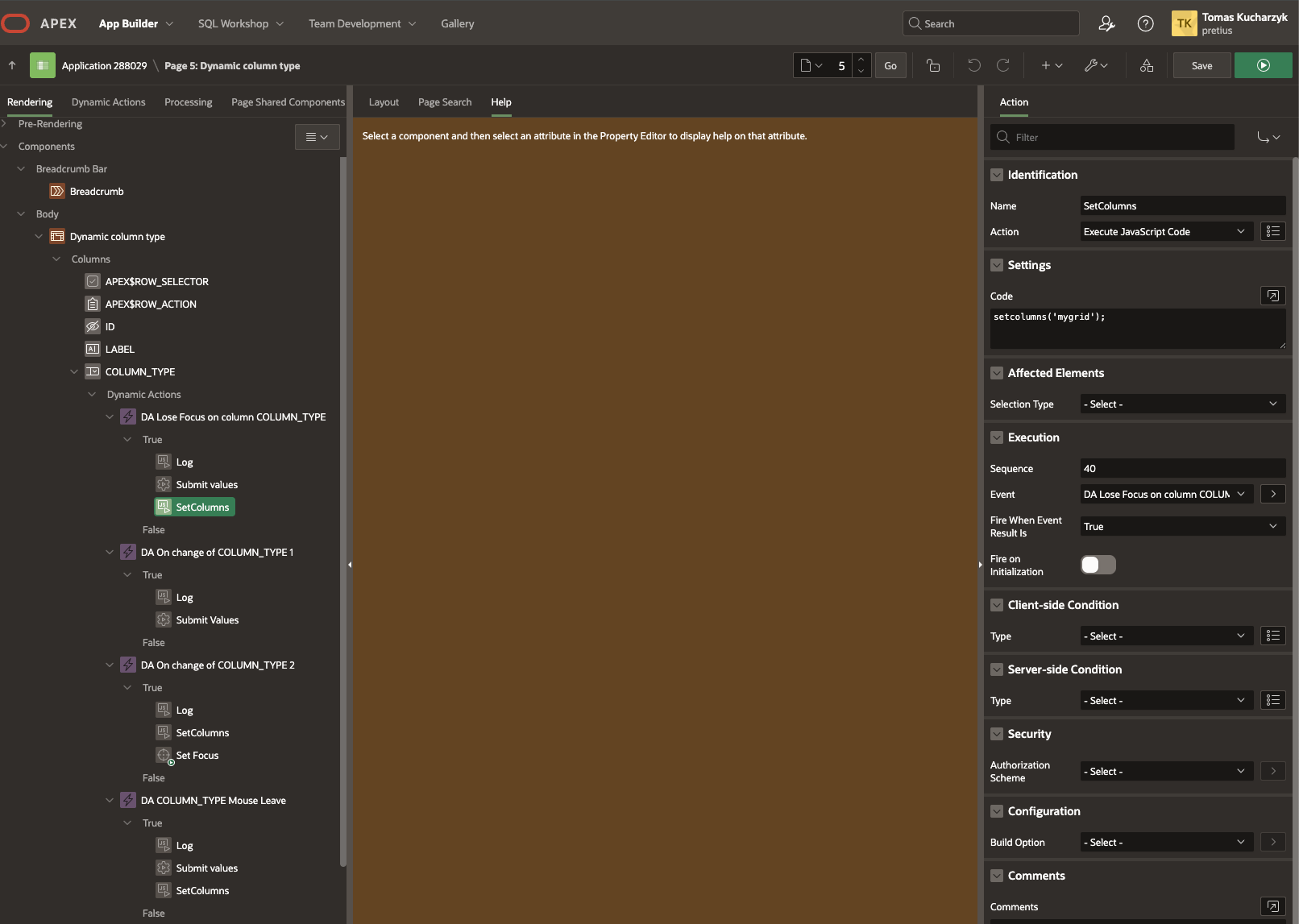 The dynamic actions are a combination of submit values for the COLUMN_TYPE and calling the JavaScript function setcolumns. With one additional function that does Set Focus on VALUE_VARCHAR – to leave the column type field and submit the value after change.