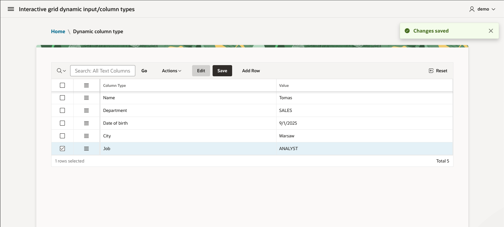 When it comes to dynamic column types, you often won’t really be able to use native authorizations and validations. But not in this case. All the columns can use the authorization, all the client/server side conditions, and also validations. The native one, for the column type, but also additional custom validations that you can attach to an interactive grid column.