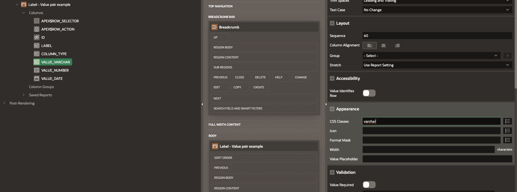 To target the columns and cells precisely, we will add some classes to the columns’ attributes. To the VALUE_VARCHAR column, we add varchar. And the same for the other columns, date for the VALUE_DATE and number for the VALUE_NUMBER column.