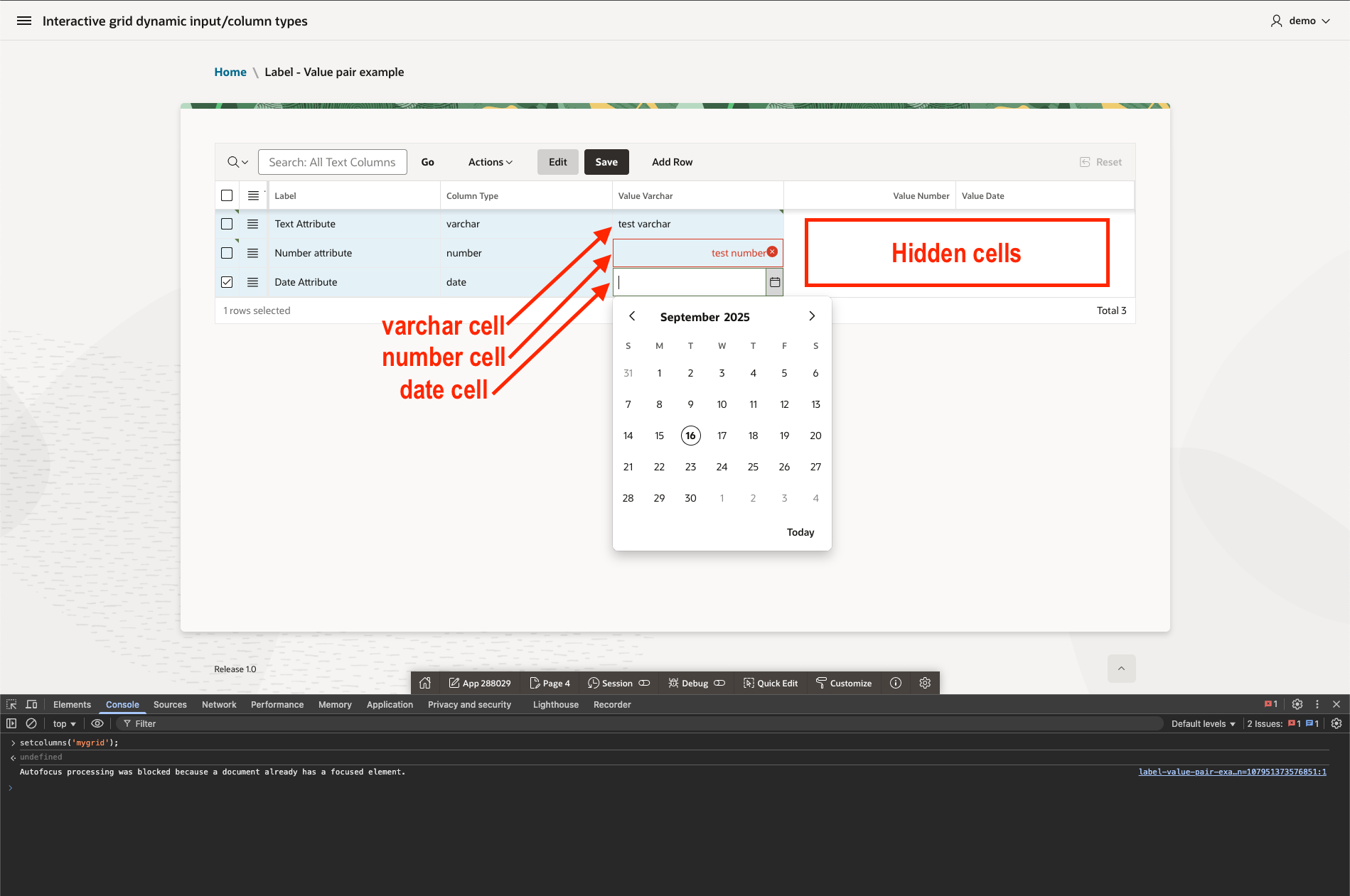 Now, we are all ready to see the result. If we run the function in the console (setcolumns(‘mygrid’);), we will see that some columns disappeared. If we try to edit the cells visible in the Value Varchar column, we can see that the cells are of a different type.