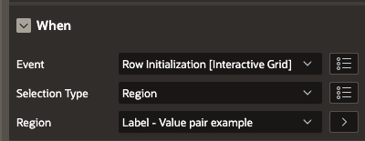 We will add a dynamic action that will run the JavaScript function for us automatically. I added an action for the event Row Initialization [Interactive Grid], but you may add multiple events to trigger the function in more cases.
