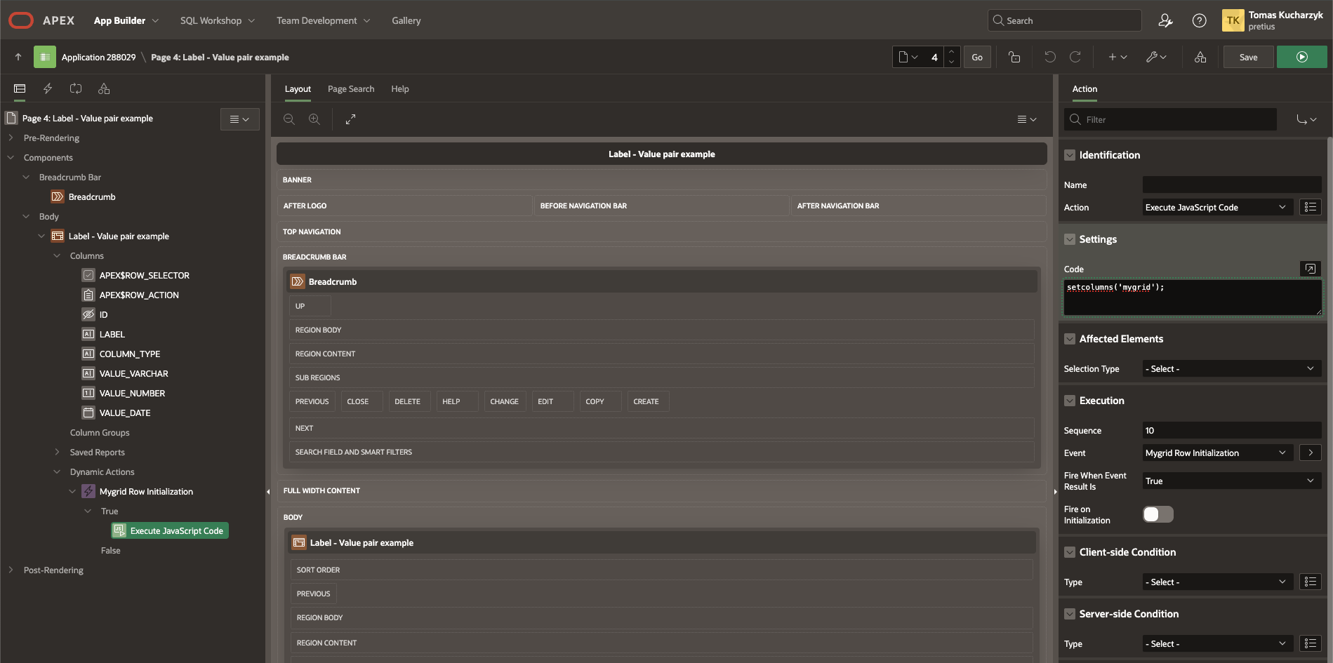 Now, the tricky part of this solution is the dynamic actions. First, we need a DA at the point of Rows initialization (same as in the previous example), but we also need to set multiple actions to submit the value of the COLUMN_TYPE and then refresh the grid columns using the setcolumns javascript function.