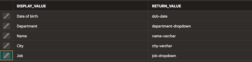 We will create one more table: DYNAMIC_LOV. It will serve as a column type for the grid. It will have two columns, display_value and return_value.