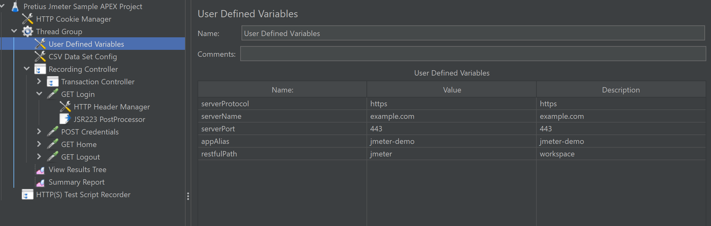 3. Expand the tree to find User Defined Variables and change the variable values to refer to your app, e.g. https://example.com/ords/r/jmeter/jmeter-demo.