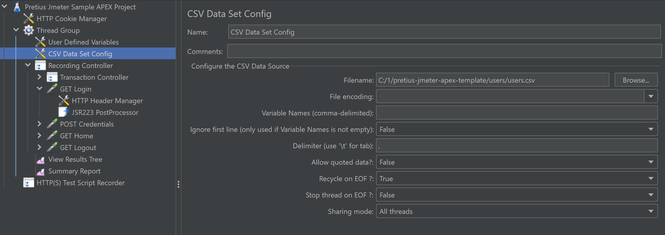 4. Find CSV Data Set Config and use the Browse button to change the File Name to point at /users/users.csv.