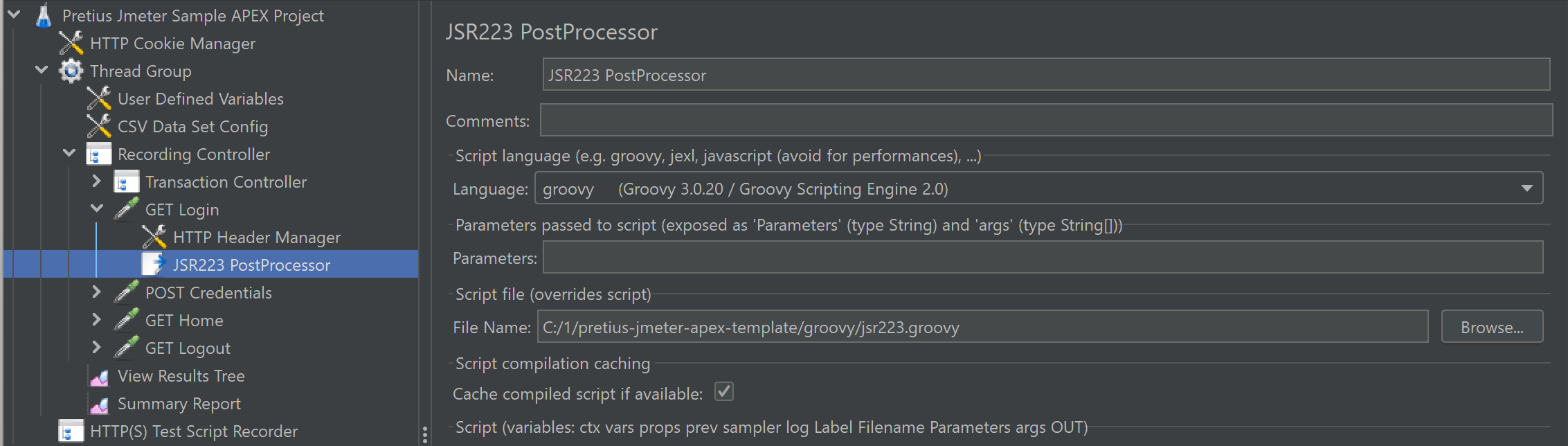 6. Find JSR223 PostProcessor and use the Browse button to change the File Name to point at /groovy/jsr223.groovy.