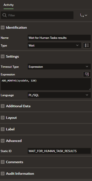So, as the next step, I add a Wait step. In the Timeout Type field, I select Expression and enter a deadline that is very far in the future and sufficient to ensure that I get the result from my tasks (in other words, I’m sure the tasks will be completed before this deadline). In my case, this is the current date + 10 years. In the Expression field, I enter the value ADD_MONTHS(sysdate, 120).