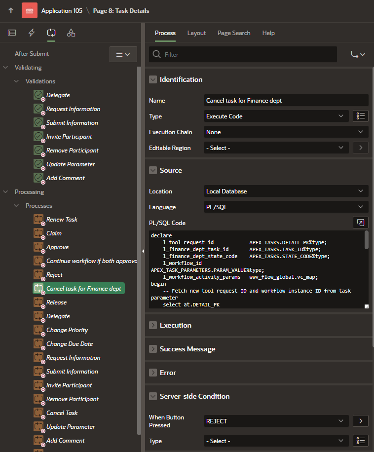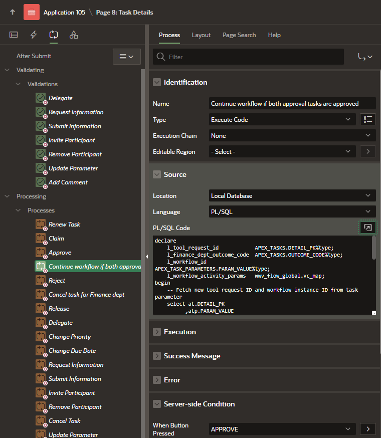 declare l_tool_request_id APEX_TASKS.DETAIL_PK%type; l_finance_dept_outcome_code APEX_TASKS.OUTCOME_CODE%type; l_workflow_id APEX_TASK_PARAMETERS.PARAM_VALUE%type; l_workflow_activity_params wwv_flow_global.vc_map; begin -- Fetch new tool request ID and workflow instance ID from task parameter select at.DETAIL_PK ,atp.PARAM_VALUE into l_tool_request_id ,l_workflow_id from APEX_TASKS at join APEX_TASK_PARAMETERS atp on at.TASK_ID = atp.TASK_ID where at.TASK_ID = :P8_TASK_ID and atp.PARAM_STATIC_ID = 'APEX_WORKFLOW_ID'; -- Based on new tool request ID, find task outcome for Finance Department select OUTCOME_CODE into l_finance_dept_outcome_code from APEX_TASKS where DETAIL_PK = l_tool_request_id and TASK_DEF_STATIC_ID = 'FINANCE_DEPT_APPROVAL_TASK'; -- Continue Wait activity in workflow if outcome is APPROVED if l_finance_dept_outcome_code = 'APPROVED' then apex_workflow.continue_activity( p_instance_id => l_workflow_id, p_static_id => 'WAIT_FOR_HUMAN_TASK_RESULTS', p_activity_params => l_workflow_activity_params ); end if; exception when others then -- Error handling... raise; end;