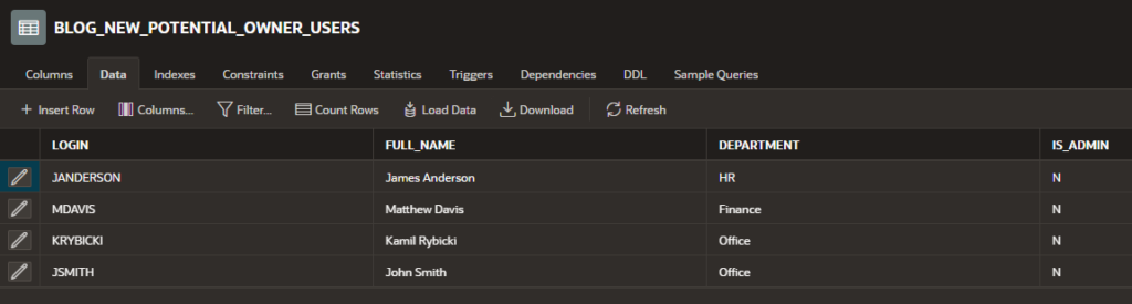 At this point, my Business Administrators are people who have the IS_ADMIN flag set to Y, and my “system” user named MY_SYSTEM_USER (this user was not created anywhere; the name was invented by me). I will need this system user later.