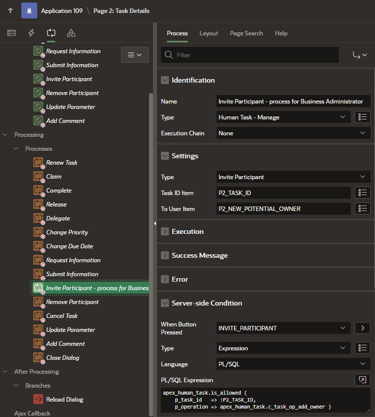 Next, I duplicate this process, creating a new one, name it Invite Participant – process for Actual Owner, and change the PL/SQL Expression code in the Server-side Condition to the following: