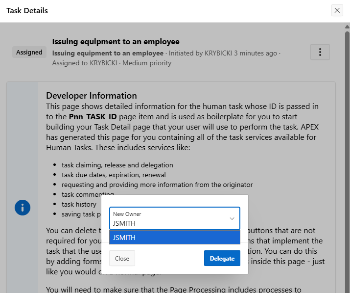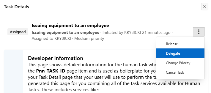 In the aforementioned application, issuing the equipment is a Human Task (of type Action Task), and the Potential Owners of this task are Office employees. Unfortunately, sometimes it happens that Office employees cannot issue the equipment due to vacations or other time-consuming tasks. In such a situation, they would like to be able to delegate the equipment issuance to any other person in the company with whom they have arranged, and sometimes it may be someone from the HR department, and another time someone else, e.g., an accountant with whom the office employees have very good contact and trust.