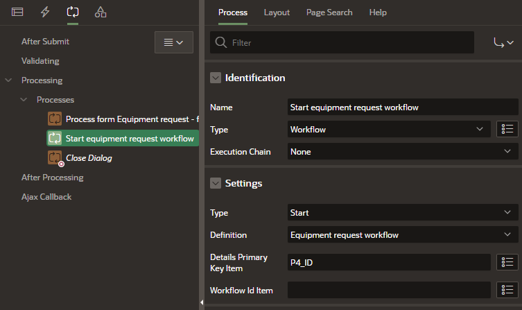 In the application, I also created two pages for handling equipment requests (Interactive Report + Form on the BLOG_NEW_POTENTIAL_OWNER_REQUESTS table). On the form page, I added a process that, after inserting the request data, runs my workflow from the screenshot above using a process type called Workflow.