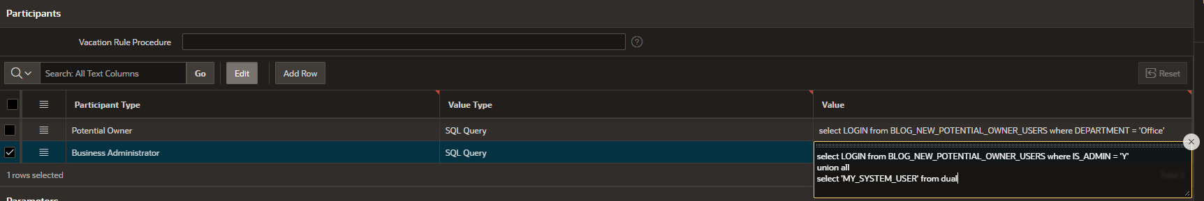 In my task, I modify the SQL query for the Business Administrator in the Participants section and paste the following query: