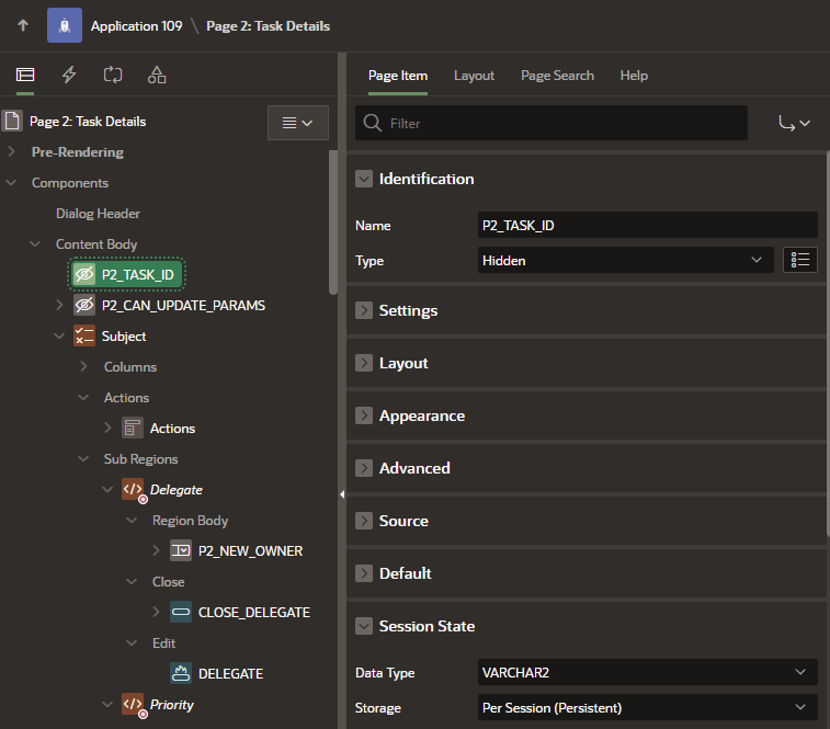 I go to the details page of my Human Task and change the Storage for my item P2_TASK_ID to Per Session (Persistent).