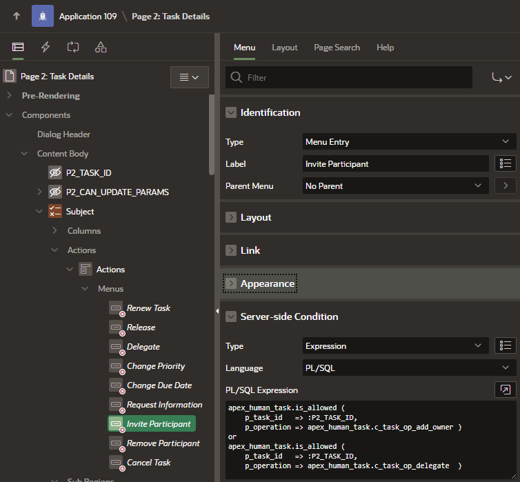apex_human_task.is_allowed ( p_task_id => :P2_TASK_ID, p_operation => apex_human_task.c_task_op_add_owner ) or apex_human_task.is_allowed ( p_task_id => :P2_TASK_ID, p_operation => apex_human_task.c_task_op_delegate )