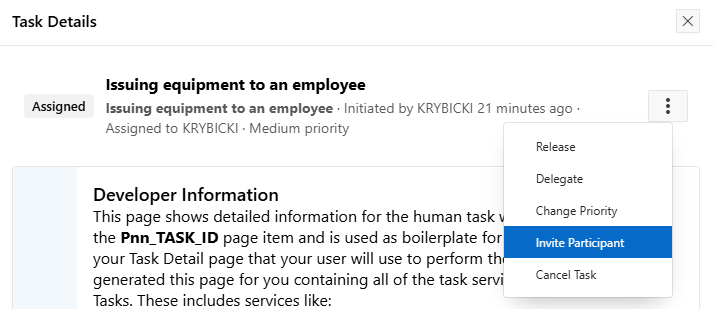 After applying a few changes to the pages generated by APEX, I am able to assign a Human Task to a person who was not initially defined on the list of potential owners. What’s more, I can do this while logged in as a user who does not have Business Administrator privileges, using a workaround with creating a “technical” session, which is immediately deleted after performing the appropriate action.